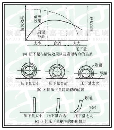 ????? 這也可從刷毛磨損的形態(tài)來(lái)判斷。如果刷毛頂端是平齊的,則說(shuō)明刷毛基本未變形,壓人量太小,無(wú)刷洗作用;如果刷毛頂部較長(zhǎng)一段范圍內(nèi)都有磨損,刷毛變成扁尖形狀,則說(shuō)明壓下量太大,這種情況刷毛極易被折斷或磨斷。正常的刷毛頂端略有傾斜,這時(shí)的彈力最足,刷洗力最強(qiáng),因而效果最好,而且壽命也較長(zhǎng)。